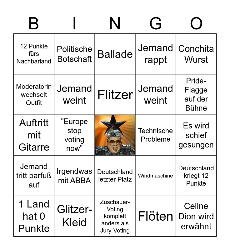 This bingo card has a free space and 24 words: 1 Land hat 0 Punkte, Irgendwas mit ABBA, Flitzer, Flöten, Conchita Wurst, 12 Punkte fürs Nachbarland, Politische Botschaft, Ballade, Technische Probleme, Es wird schief gesungen, Auftritt mit Gitarre, Jemand weint, Windmaschine, Deutschland kriegt 12 Punkte, Moderatorin wechselt Outfit, Glitzer-Kleid, Zuschauer-Voting komplett anders als Jury-Voting, Jemand rappt, Pride-Flagge auf der Bühne, Jemand tritt barfuß auf, "Europe stop voting now", Deutschland letzter Platz, Jemand weint and Celine Dion wird erwähnt.