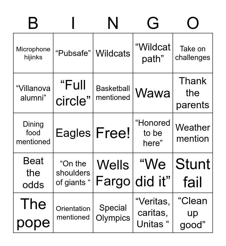 This bingo card has a free space and 29 words: The pope, Covid, Eagles, Hoopsmania, Microphone hijinks, Wildcats, “Full circle”, “On the shoulders of giants “, “Honored to be here”, Orientation mentioned, Weather mention, “Clean up good”, Special Olympics, “Veritas, caritas, Unitas “, Thank the parents, “As I look out…”, Wells Fargo, Beat the odds, Take on challenges, Dining food mentioned, “We did it”, Future leaders of __\, Wawa, “Villanova alumni”, “Wildcat path”, “Pubsafe”, Stunt fail, Basketball mentioned and Speaker applauds/laughs for self.