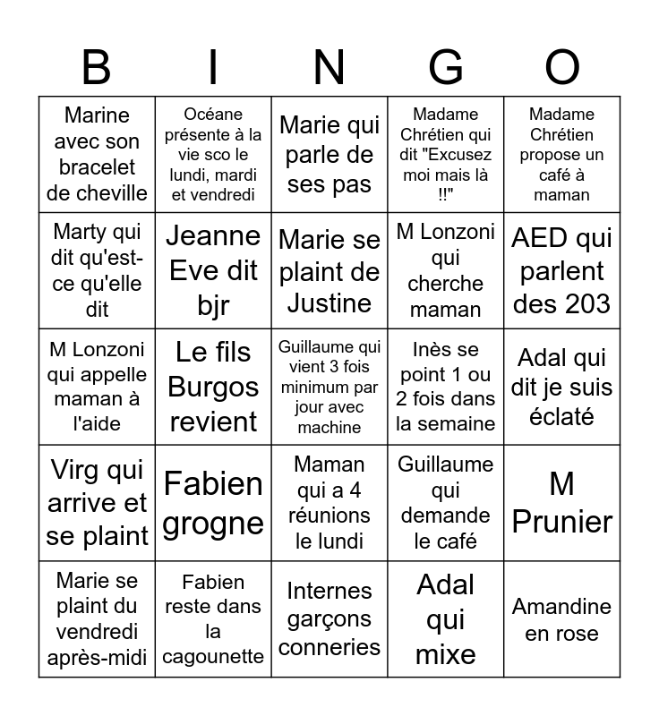 This bingo card has a free space and 24 words: Fabien grogne, Fabien reste dans la cagounette, Marie se plaint de Justine, Marie se plaint du vendredi après-midi, Madame Chrétien propose un café à maman, Marine avec son bracelet de cheville, Marty qui dit qu'est-ce qu'elle dit, Océane présente à la vie sco le lundi, mardi et vendredi, Inès se point 1 ou 2 fois dans la semaine, Maman qui a 4 réunions le lundi, M Lonzoni qui cherche maman, M Lonzoni qui appelle maman à l'aide, Guillaume qui demande le café, M Prunier, Jeanne Eve dit bjr, Adal qui mixe, Adal qui dit je suis éclaté, Marie qui parle de ses pas, AED qui parlent des 203, Le fils Burgos revient, Amandine en rose, Virg qui arrive et se plaint, Madame Chrétien qui dit "Excusez moi mais là !!" and Internes garçons conneries.