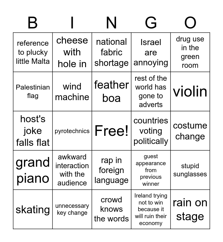 This bingo card has a free space and 35 words: latex/leather, removing clothes, traditional instruments, wind machine, rap in foreign language, Israel are annoying, Palestinian flag, confused strait guy, feather boa, bucket hats, host's joke falls flat, drug use in the green room, heavy metal, coms link to jury goes down, reference to plucky little Malta, countries voting politically, Ireland trying not to win because it will ruin their economy, pyrotechnics, grand piano, rain on stage, guest appearance from previous winner, skating, stupid sunglasses, unnecessary key change, national fabric shortage, violin, song without strobe warning, dangling, rest of the world has gone to adverts, costume change, they have been watching game of thrones, crowd knows the words, awkward interaction with the audience, cheese with hole in and they brought the band.