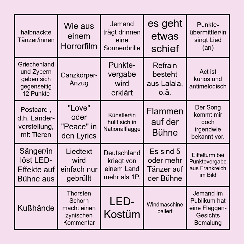 This bingo card has 50 words: absolut wilde Performance, Künstler/in hüllt sich in Nationalflagge, Traditionelles Kostüm / Tracht, LED-Kostüm, Liedtext wird einfach nur gebrüllt, Kleidungsstück ändert sich während des Auftritts, Wie aus einem Horrorfilm, Handherzen für die Zuschauer, Griechenland und Zypern geben sich gegenseitig 12 Punkte, Nebel auf der Bühne, Ganzkörper- Anzug, es geht etwas schief, Eiffelturm bei Punktevergabe aus Frankreich im Bild, Es sind 5 oder mehr Tänzer auf der Bühne, Künstler/in singt schief, Telefongeste in die Kamera, Punkte-vergabe wird erklärt, Flammen auf der Bühne, Pyrotechnik (das ist doch kein Verbrechen), Punkte-übermittler/in singt Lied (an), "Love" oder "Peace" in den Lyrics, Windmaschine ballert, halbnackte Tänzer/innen, Refrain besteht aus Lalala, o.ä., Akrobatik auf der Bühne, Jemand im Publikum hat eine Flaggen- Gesichts Bemalung, Act ist kurios und antimelodisch, Dem Gastgeber wird für den Abend gedankt, Jemand trägt drinnen eine Sonnenbrille, Deutschland kriegt von einem Land mehr als 1P., Im Greenroom wird angestoßen, "Good Evening Europe good morning Australia", Sänger/in ist Barfuß, Jemand sagt „Grand Prix“, Thorsten Schorn macht einen zynischen Kommentar, 12 Punkte für Deutschland, Outfit aus Lack und Leder, Duett, Konfetti-Regen, Der Song kommt mir doch irgendwie bekannt vor., Goldregen, Overknees, "You're good to go", Die Halle singt laut hörbar mit, Kußhände, Postcard , d.h. Länder-vorstellung, mit Tieren, lange künstliche Fingernägel, Sänger/in steht auf Podest oder ähnlichem, Sänger/in löst LED-Effekte auf Bühne aus and Punkte erbetteln.