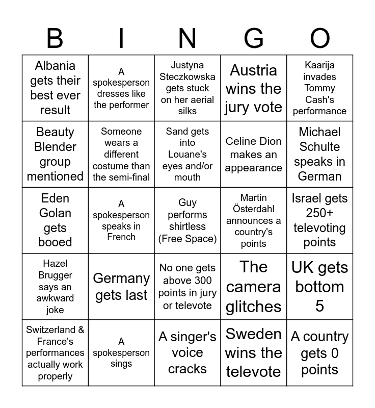 This bingo card has a free space and 24 words: Germany gets last, A spokesperson sings, Sand gets into Louane's eyes and/or mouth, Switzerland & France's performances actually work properly, Kaarija invades Tommy Cash's performance, Albania gets their best ever result, Beauty Blender group mentioned, A spokesperson dresses like the performer, Martin Österdahl announces a country's points, No one gets above 300 points in jury or televote, Celine Dion makes an appearance, Eden Golan gets booed, The camera glitches, UK gets bottom 5, Someone wears a different costume than the semi-final, Sweden wins the televote, Israel gets 250+ televoting points, Justyna Steczkowska gets stuck on her aerial silks, Michael Schulte speaks in German, A spokesperson speaks in French, A country gets 0 points, Hazel Brugger says an awkward joke, Austria wins the jury vote and A singer's voice cracks.