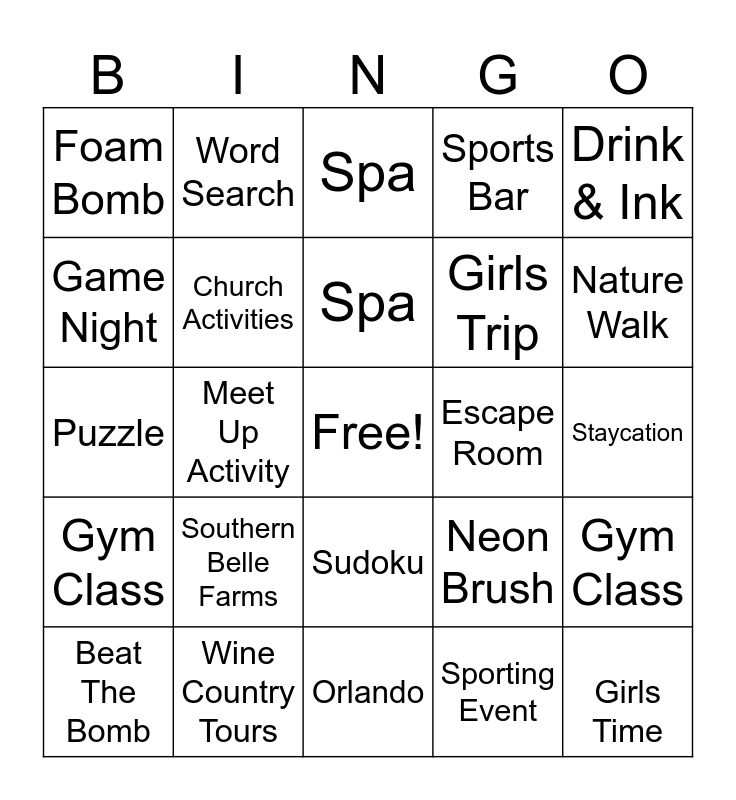 This bingo card has a free space and 24 words: Southern Belle Farms, Wine Country Tours, Spa, Beat The Bomb, Drink & Ink, Foam Bomb, Game Night, Word Search, Escape Room, Sudoku, Girls Trip, Puzzle, Neon Brush, Gym Class, Church Activities, Sporting Event, Staycation, Spa, Nature Walk, Meet Up Activity, Girls Time, Gym Class, Sports Bar and Orlando.