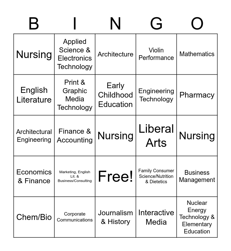 This bingo card has 26 words: Free!, Interactive Media, Early Childhood Education, Corporate Communications, Mathematics, Nursing, English Literature, Applied Science & Electronics Technology, Nursing, Family Consumer Science/Nutrition & Dietetics, Engineering Technology, Architectural Engineering, Business Management, Chem/Bio, Finance & Accounting, Middle Grades Education, Violin Performance, Economics & Finance, Architecture, Nursing, Pharmacy, Journalism & History, Liberal Arts, Marketing, English Lit. & Business/Consulting, Print & Graphic Media Technology and Nuclear Energy Technology & Elementary Education.