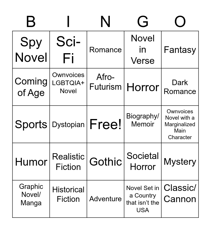 This bingo card has a free space and 24 words: Realistic Fiction, Historical Fiction, Afro- Futurism, Graphic Novel/ Manga, Fantasy, Spy Novel, Coming of Age, Sci-Fi, Biography/ Memoir, Gothic, Horror, Sports, Societal Horror, Mystery, Ownvoices LGBTQIA+ Novel, Novel Set in a Country that isn’t the USA, Ownvoices Novel with a Marginalized Main Character, Romance, Dark Romance, Dystopian, Classic/ Cannon, Humor, Novel in Verse and Adventure.