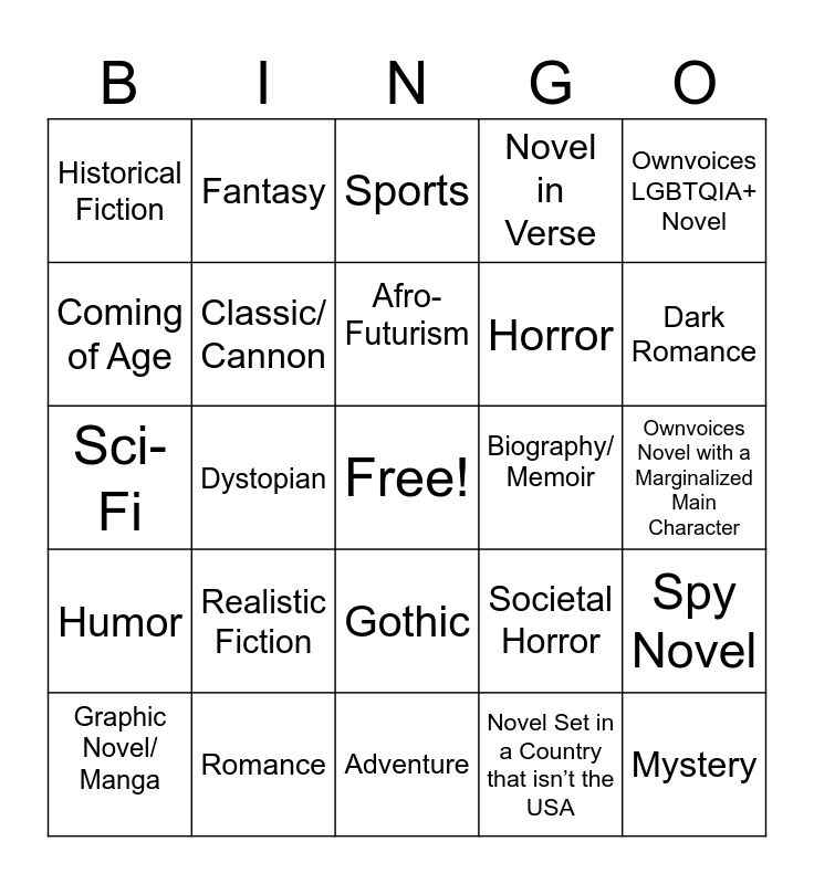 This bingo card has a free space and 24 words: Realistic Fiction, Romance, Afro- Futurism, Graphic Novel/ Manga, Ownvoices LGBTQIA+ Novel, Historical Fiction, Coming of Age, Fantasy, Biography/ Memoir, Gothic, Horror, Sci-Fi, Societal Horror, Spy Novel, Classic/ Cannon, Novel Set in a Country that isn’t the USA, Ownvoices Novel with a Marginalized Main Character, Sports, Dark Romance, Dystopian, Mystery, Humor, Novel in Verse and Adventure.