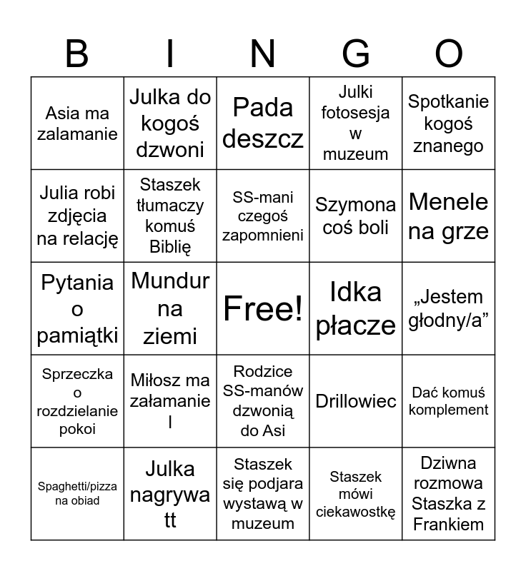 This bingo card has a free space and 24 words: Miłosz ma załamanie l, Julka nagrywa tt, SS-mani czegoś zapomnieni, Spaghetti/pizza na obiad, Spotkanie kogoś znanego, Asia ma zalamanie, Julia robi zdjęcia na relację, Julka do kogoś dzwoni, Idka płacze, Rodzice SS-manów dzwonią do Asi, Szymona coś boli, Pytania o pamiątki, Drillowiec, Dać komuś komplement, Staszek tłumaczy komuś Biblię, Staszek mówi ciekawostkę, „Jestem głodny/a”, Pada deszcz, Menele na grze, Mundur na ziemi, Dziwna rozmowa Staszka z Frankiem, Sprzeczka o rozdzielanie pokoi, Julki fotosesja w muzeum and Staszek się podjara wystawą w muzeum.