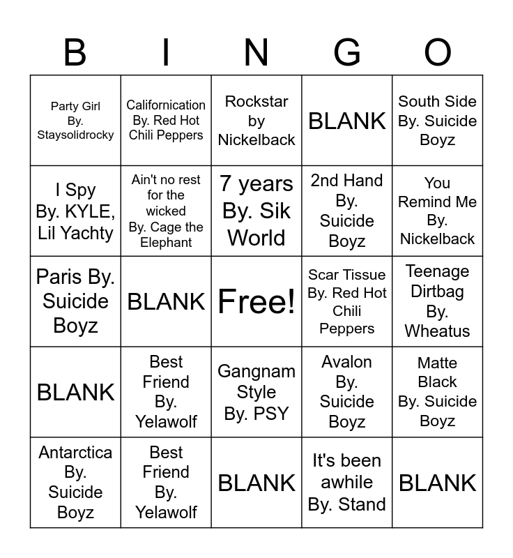 This bingo card has a free space and 24 words: Best Friend By. Yelawolf, Best Friend By. Yelawolf, 7 years By. Sik World, Antarctica By. Suicide Boyz, South Side By. Suicide Boyz, Party Girl By. Staysolidrocky, I Spy By. KYLE, Lil Yachty, Californication By. Red Hot Chili Peppers, Scar Tissue By. Red Hot Chili Peppers, Gangnam Style By. PSY, 2nd Hand By. Suicide Boyz, Paris By. Suicide Boyz, Avalon By. Suicide Boyz, Matte Black By. Suicide Boyz, Ain't no rest for the wicked By. Cage the Elephant, It's been awhile By. Stand, Teenage Dirtbag By. Wheatus, Rockstar by Nickelback, You Remind Me By. Nickelback, BLANK, BLANK, BLANK, BLANK and BLANK.