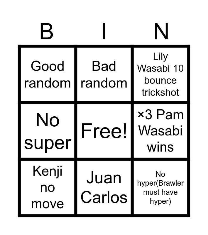 This bingo card has a free space and 8 words: ×3 Pam Wasabi wins, Lily Wasabi 10 bounce trickshot, Bad random, Kenji no move, Good random, No hyper(Brawler must have hyper), No super and Juan Carlos.