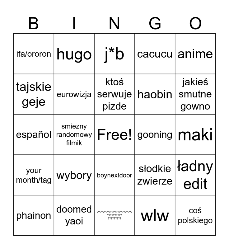 This bingo card has a free space and 24 words: wybory, doomed yaoi, ktoś serwuje pizde, phainon, anime, ifa/ororon, tajskie geje, hugo, gooning, boynextdoor, haobin, español, słodkie zwierze, ładny edit, eurowizja, wlw, maki, j*b, jakieś smutne gowno, smiezny randomowy filmik, coś polskiego, your month/tag, cacucu and ???????????????????????? ?????????? ?????????.