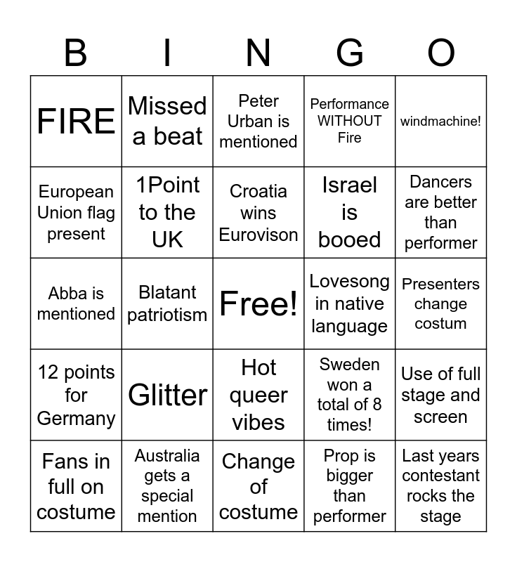 This bingo card has a free space and 25 words: Glitter, Change of costume, Croatia wins Eurovison, Fans in full on costume, windmachine!, FIRE, European Union flag present, Missed a beat, Lovesong in native language, Hot queer vibes, Israel is booed, Abba is mentioned, Sweden won a total of 8 times!, Use of full stage and screen, 1Point to the UK, Thorsten Schorn is mean, Presenters change costum, Peter Urban is mentioned, Dancers are better than performer, Blatant patriotism, Last years contestant rocks the stage, Australia gets a special mention, 12 points for Germany, Performance WITHOUT Fire and Prop is bigger than performer.