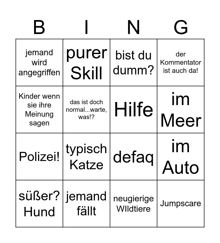 This bingo card has 16 words: jemand fällt, im Auto, bist du dumm?, jemand wird angegriffen, Polizei!, purer Skill, defaq, neugierige WIldtiere, Kinder wenn sie ihre Meinung sagen, das ist doch normal...warte, was!?, süßer?Hund, der Kommentator ist auch da!, typisch Katze, im Meer, Hilfe and Jumpscare.