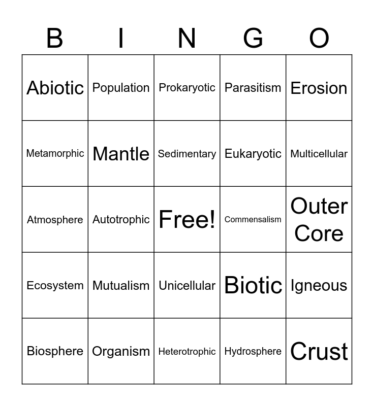 This bingo card has a free space and 24 words: Mutualism, Organism, Sedimentary, Biosphere, Erosion, Abiotic, Metamorphic, Population, Commensalism, Unicellular, Eukaryotic, Atmosphere, Biotic, Igneous, Mantle, Hydrosphere, Outer Core, Prokaryotic, Multicellular, Autotrophic, Crust, Ecosystem, Parasitism and Heterotrophic.