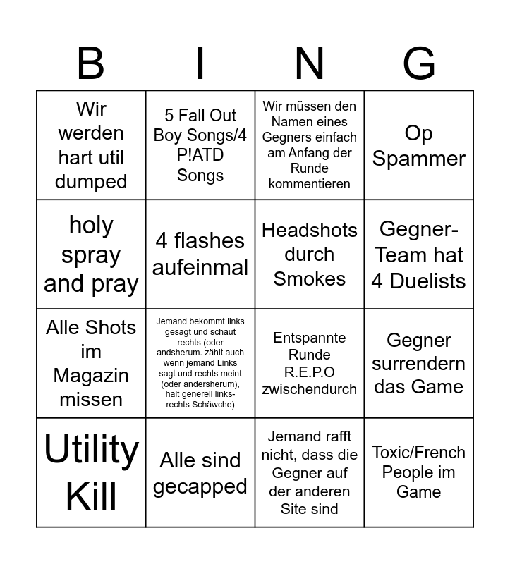 This bingo card has 25 words: Teammate singt im Voice Chat, „Let’s play slow“ – und es wird instant gerusht, Gegner-Team hat 4 Duelists, Gegner schreibt „report [Name]“ ohne Grund, holy spray and pray, Wir werden hart util dumped, 4 flashes aufeinmal, 5 Fall Out Boy Songs/4 P!ATD Songs, Alle sind gecapped, Ein Gegner hat am Ende 0 Kills (+1 Runde beim Punishment wenns eine Sage ist), Alle Shots im Magazin missen, Entspannte Runde R.E.P.O zwischendurch, Spontaner Vandal Headshot, Es wird etwas gequoted, Headshots durch Smokes, Einer (außer Chris) steht nach dem Game positiv in unserem Team, Jemand rafft nicht, dass die Gegner auf der anderen Site sind, Wir müssen den Namen eines Gegners einfach am Anfang der Runde kommentieren, Jemand bekommt links gesagt und schaut rechts (oder andsherum. zählt auch wenn jemand Links sagt und rechts meint (oder andersherum), halt generell links-rechts Schäwche), Gegner surrendern das Game, Utility Kill, Agent wird beim falschen Namen genannt, Toxic/French People im Game, Op Spammer and Mysteriös viele Headshots.