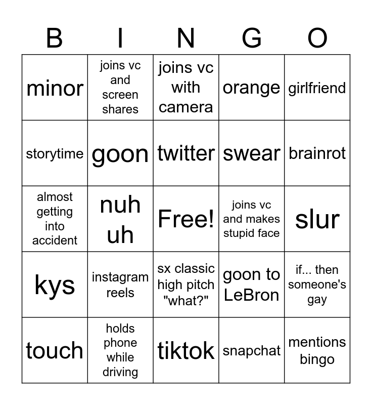 This bingo card has a free space and 24 words: touch, instagram reels, twitter, snapchat, girlfriend, minor, joins vc and screen shares, joins vc with camera, joins vc and makes stupid face, slur, almost getting into accident, goon, goon to LeBron, if... then someone's gay, storytime, holds phone while driving, tiktok, orange, brainrot, kys, nuh uh, sx classic high pitch "what?", swear and mentions bingo.