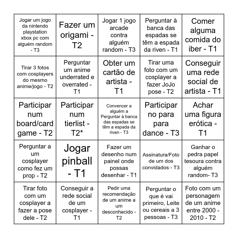 This bingo card has 40 words: Ter o teu nome em japonês - T1, Participar num board/card game - T2, Perguntar um anime favorito - T1, Perguntar um anime underrated e overrated - T1, Conseguir a rede social de um cosplayer - T1, Fazer um desenho num painel onde possas desenhar - T1, Obter um cartão de artista - T1, Participar em algum gatcha - T2, Comer alguma comida do iber - T1, Perguntar a um cosplayer como fez um prop - T2, Participar num tierlist - T2*, Perguntar à banca das espadas se têm a espada da riven - T1, Convencer a alguém a Perguntar à banca das espadas se têm a espada da riven - T3, Achar uma figura erótica - T1, Participar no para para dance - T3, Jogar pinball - T1, Jogar nintendo playstation xbox pc - T2, Jogar um jogo da nintendo playstation xbox pc com alguém random - T3, Jogar 2 jogos de arcade japonês - T2, Jogar 1 jogo arcade contra alguém random - T3, Ganhar o pedra papel tesoura contra alguém random- T3, Perguntar o que é vai primeiro, Leite ou cereais a 3 pessoas - T3, Tirar uma foto com um cosplayer a fazer JoJo pose - T2, Tirar 3 fotos com cosplayers do mesmo anime/jogo - T2, Tirar foto com um personagem de um anime/jogo que aches overrated - T1, Foto com um personagem que não conheças - T1, Foto com alguém a fazer cosplay genderbend / trap - T2, Foto com um cosplayer do teu jogo/anime favorito - T1, Foto com um personagem de um anime entre 2000 - 2010 - T2, Foto com um personagem de um anime entre 2010 - 2015 - T2, Foto com um personagem da temporada anterior de anime - T2, Tirar foto com um cosplayer a fazer a pose dele - T2, Trocar um item por outro com alguém - T3, Assinatura/Foto de um dos convidados - T3, Conseguir uma rede social de artista - T1, Pedir uma recomendação de um anime a um desconhecido - T2, Convecer o teammate a comprar alguma coisa - T3, Dar um desafio do bingo a outra pessoa - T3, Fazer um origami - T2 and Fazer um onigiri(Language craft 12:00 Sala das oficinas) - T3.