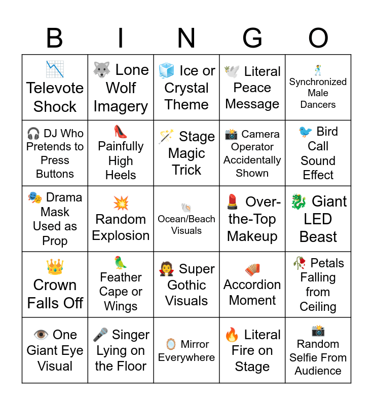 This bingo card has a free space and 24 words: 🦜 Feather Cape or Wings, 🎤 Singer Lying on the Floor, 🪄 Stage Magic Trick, 👁️ One Giant Eye Visual, 🕺 Synchronized Male Dancers, 📉 Televote Shock, 🎧 DJ Who Pretends to Press Buttons, 🐺 Lone Wolf Imagery, 💄 Over-the-Top Makeup, 🧛 Super Gothic Visuals, 📸 Camera Operator Accidentally Shown, 🎭 Drama Mask Used as Prop, 🪗 Accordion Moment, 🥀 Petals Falling from Ceiling, 👠 Painfully High Heels, 🔥 Literal Fire on Stage, 🐉 Giant LED Beast, 🧊 Ice or Crystal Theme, 🐦 Bird Call Sound Effect, 💥 Random Explosion, 📸 Random Selfie From Audience, 👑 Crown Falls Off, 🕊️ Literal Peace Message and 🪞 Mirror Everywhere.