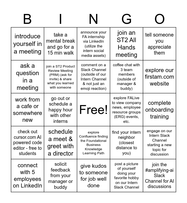 This bingo card has a free space and 24 words: schedule a meet & greet with a director, solicit feedback from your manager or buddy, comment on a Slack Channel (outside of our Intern Channel & not just an emoji reaction), connect with 5 employees on LinkedIn, tell someone you appreciate them, introduce yourself in a meeting, ask a question in a meeting, take a mental break and go for a 15 min walk, explore FALive to view company news, employee resource groups (ERG) events, etc., explore Confluence finding the Foundational Business Knowledge Learning Path, coffee chat with 3 team members (outside of manager & buddy), work from a cafe or somewhere new, find your intern neighbor (closest distance to you), engage on our Intern Slack Channel starting a new topic for discussion, join a ST2 Product Review Meeting (PRM) (ask for invite) & share what you learned with someone, post a picture of yourself doing your favorite hobby on our Intern Slack Channel, complete onboarding training, announce your FA internship via LinkedIn (utilize the intern social media assets), explore our firstam.com website, go out or schedule a happy hour with other interns, join the #amplifying-ai Slack Channel for AI discussions, check out cursor.com AI powered code editor - free to students, join an ST2 All Hands meeting and give kudos to someone for job well done.