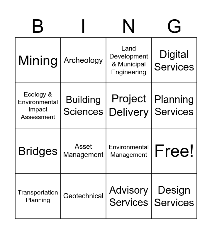 This bingo card has 20 words: Free!, Planning, Landscape Architecture & Urban Design, Land Development & Municipal Engineering, Water & Wastewater, Transportation Planning, Ecology & Environmental Impact Assessment, Geotechnical, Mining, Bridges, Archeology, Asset Management, Environmental Management, Building Sciences, Design Services, Project Delivery, FREE, Planning Services, Digital Services, Advisory Services and Net Zero.