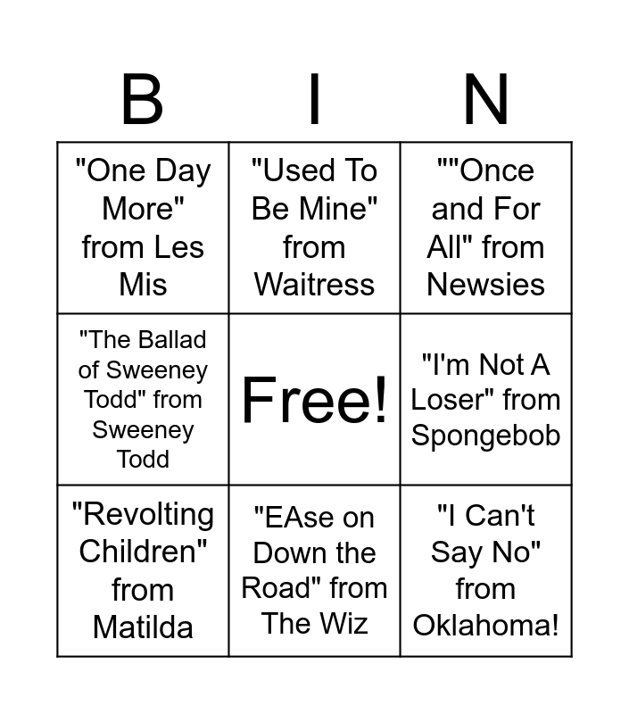 This bingo card has a free space and 12 words: "Wait for Me" from Hadestown, "Ex Wives" from SIX, "I Can't Say No" from Oklahoma!, "I'm Not A Loser" from Spongebob, "Used To Be Mine" from Waitress, ""Once and For All" from Newsies, "EAse on Down the Road" from The Wiz, "Skimbleshanks the Railway Cat" from Cats, "One Day More" from Les Mis, "The Ballad of Sweeney Todd" from Sweeney Todd, "Revolting Children" from Matilda and "It Takes Two" from Into The Woods.