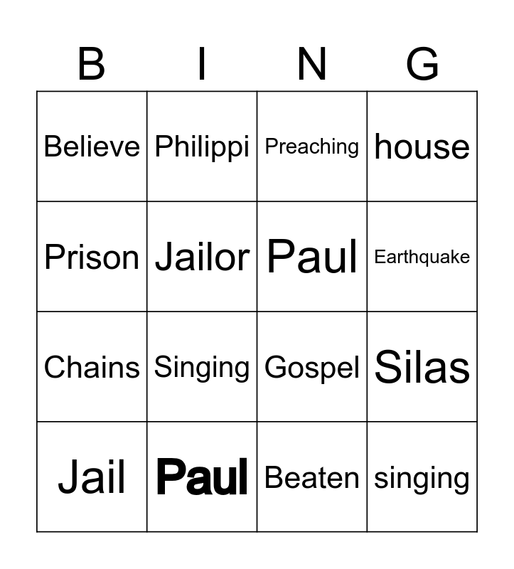 This bingo card has 16 words: Paul, Silas, Preaching, Believe, Chains, Philippi, Gospel, Beaten, Prison, Jailor, Jail, house, Singing, Earthquake, Paul and singing.