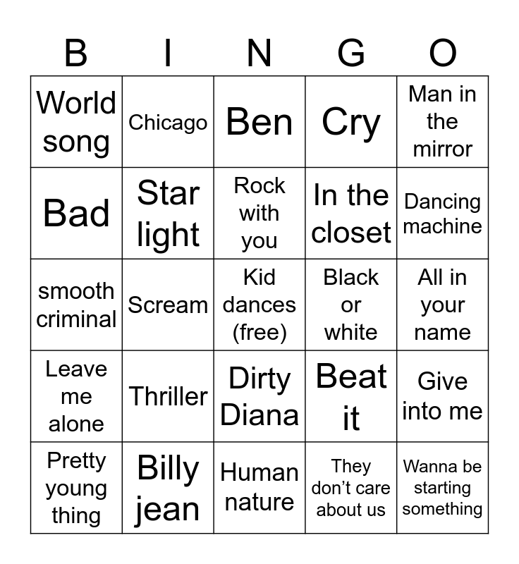 This bingo card has a free space and 24 words: Thriller, Billy jean, Rock with you, Pretty young thing, Man in the mirror, World song, Bad, Chicago, Black or white, Dirty Diana, In the closet, smooth criminal, Beat it, Give into me, Star light, They don’t care about us, All in your name, Ben, Dancing machine, Scream, Wanna be starting something, Leave me alone, Cry and Human nature.