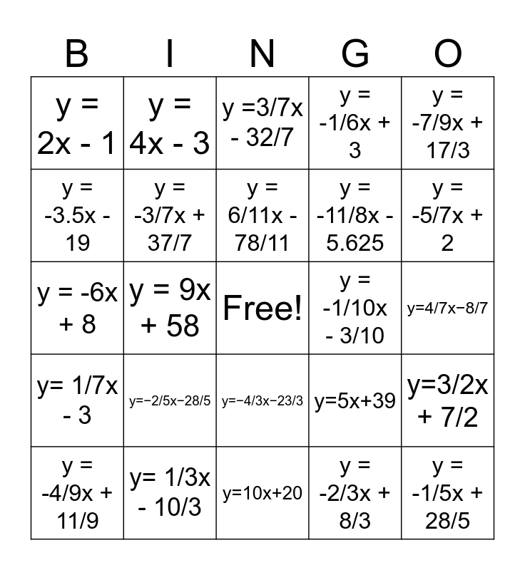 This bingo card has a free space and 60 words: y = -¼x + 23/4, y= 1/3x - 10/3, y = -1.2x - 3.8, y= 1/7x - 3, y = -2/3x + 8/3, y= 5/2x-22, y = -3/7x + 37/7, y = -4/2x 5/9, y = -11/8x - 5.625, y = 9/5x - 16, y = -1/6x + 3, y = -4/5x + 3/5, y = -3.5x - 19, y = 8/3x - 14, y = -6/11x - 13/11, y = 2x - 1, y = -1/5x + 28/5, y = -7/9x + 17/3, y = -5/4x - 3.25, y = 6/11x - 78/11, y = -1/10x - 3/10, y =3/7x - 32/7, y = -4/9x + 11/9, y=3/2x + 7/2, y = -2x + 13, y= 3/10x-31/10, y = -8/5x - 5.6, y=-8/7x+66/7, y = -5/7x + 2, y=4/3x+7/3, y=3x−13, y = 2/5x + 9/5, y = 7x + 19, y=2/3x−4, y = 4x - 3, y=5/6x+19/3, y=−3/4x+9/4, y = 9x + 58, y=1/3x+17/3, y = -6x + 8, y = 8x + 22, y=−2/5x−28/5, y=4/7x−8/7, y=−7/2x+18, y=5x+39, y=−3/8x−53/8, y=2x+5, y=−5/9x−34/9, y=6/7x+44/7, y=−4/3x−23/3, y=10x+20, y=7/5x+6/5, y=−11/6x−29/6, y=12x−62, y=9/4x−15/4, y=−2/7x−31/7, y=5/3x+47/3, y=−8/5x+57/5, y=1/2x+2 and y=−3/10x+62/10.