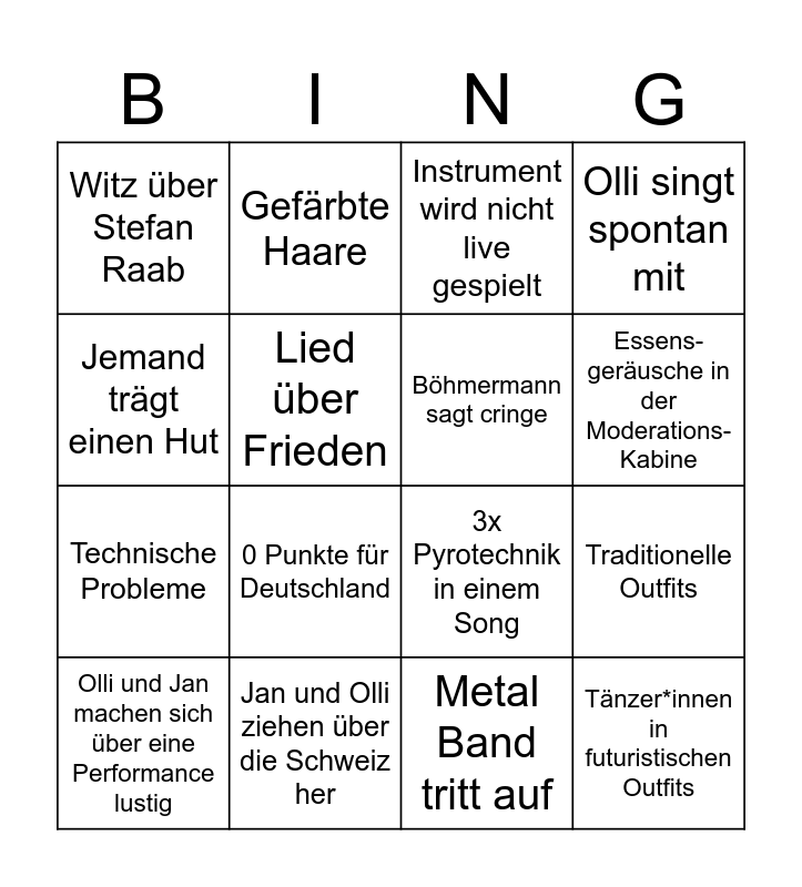 This bingo card has 16 words: Jan und Olli ziehen über die Schweiz her, Traditionelle Outfits, Instrument wird nicht live gespielt, Witz über Stefan Raab, Technische Probleme, Gefärbte Haare, 3x Pyrotechnik in einem Song, Metal Band tritt auf, Jemand trägt einen Hut, Lied über Frieden, Olli und Jan machen sich über eine Performance lustig, Olli singt spontan mit, 0 Punkte für Deutschland, Essens-geräusche in der Moderations-Kabine, Böhmermann sagt cringe and Tänzer*innen in futuristischen Outfits.