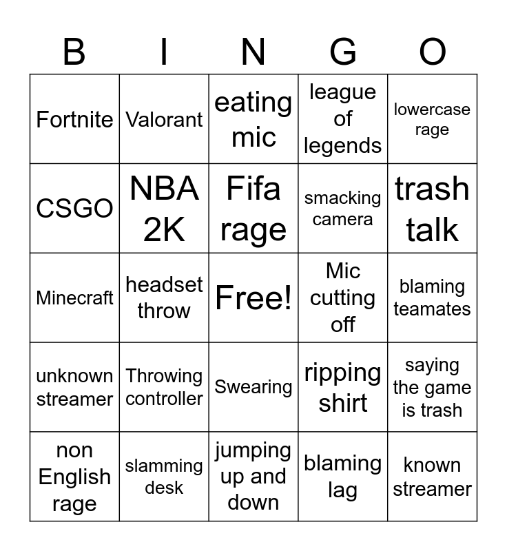 This bingo card has a free space and 24 words: Throwing controller, slamming desk, Fifa rage, non English rage, lowercase rage, Fortnite, CSGO, Valorant, Mic cutting off, Swearing, smacking camera, Minecraft, ripping shirt, saying the game is trash, NBA 2K, blaming lag, blaming teamates, eating mic, trash talk, headset throw, known streamer, unknown streamer, league of legends and jumping up and down.