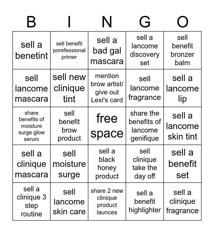 This bingo card has a free space and 24 words: sell moisture surge, sell lancome skin care, mention brow artist/ give out Lexi's card, sell a clinique 3 step routine, sell benefit bronzer balm, sell a benetint, sell lancome mascara, sell benefit porefessional primer, share the benefits of lancome genifique, sell a black honey product, sell lancome fragrance, share benefits of moisture surge glow serum, sell clinique take the day off, sell a benefit set, sell new clinique tint, sell a benefit highlighter, sell a lancome skin tint, sell a bad gal mascara, sell a lancome lip, sell benefit brow product, sell a clinique fragrance, sell a clinique mascara, sell a lancome discovery set and share 2 new clinique product launces.