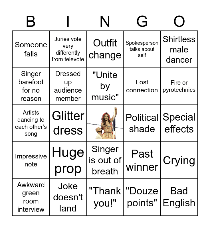 This bingo card has a free space and 25 words: Huge prop, "Thank you!", "Unite by music", Awkward green room interview, Shirtless male dancer, Someone falls, Singer barefoot for no reason, Juries vote very differently from televote, Political shade, Singer is out of breath, Lost connection, Artists dancing to each other's song, Past winner, Crying, Dressed up audience member, Audience sings along, Special effects, Outfit change, Fire or pyrotechnics, Glitter dress, Bad English, Joke doesn't land, Impressive note, Spokesperson talks about self and "Douze points".
