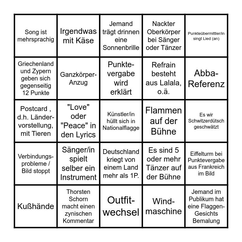 This bingo card has 50 words: Moderator/in hat sich umgezogen, Künstler/in hüllt sich in Nationalflagge, Traditionelles Kostüm / Tracht, Outfit-wechsel, Sänger/in spielt selber ein Instrument, Jemand weint, Irgendwas mit Käse, Handherzen für die Zuschauer, Griechenland und Zypern geben sich gegenseitig 12 Punkte, Nebel auf der Bühne, Ganzkörper- Anzug, Nackter Oberkörper bei Sänger oder Tänzer, Eiffelturm bei Punktevergabe aus Frankreich im Bild, Es sind 5 oder mehr Tänzer auf der Bühne, "Europe, stop voting now", Telefongeste in die Kamera, Punkte-vergabe wird erklärt, Flammen auf der Bühne, Act selbst oder die Eltern standen beim ESC schon auf der Bühne, Punkteübermittler/in singt Lied (an), "Love" oder "Peace" in den Lyrics, Wind-maschine, Song ist mehrsprachig, Refrain besteht aus Lalala, o.ä., Akrobatik auf der Bühne, Jemand im Publikum hat eine Flaggen- Gesichts Bemalung, Abba- Referenz, Dem Gastgeber wird für den Abend gedankt, Jemand trägt drinnen eine Sonnenbrille, Deutschland kriegt von einem Land mehr als 1P., Im Greenroom wird angestoßen, "Good Evening Europe good morning Australia", Sänger/in ist Barfuß, Jemand sagt „Grand Prix“, Thorsten Schorn macht einen zynischen Kommentar, 12 Punkte für Deutschland, Outfit aus Lack und Leder, Duett, Konfetti-Regen, Es wir Schwitzerdütsch geschwätzt, Goldregen, Overknees, Regenbogen-flagge, Die Halle singt laut hörbar mit, Kußhände, Postcard , d.h. Länder-vorstellung, mit Tieren, lange künstliche Fingernägel, Sänger/in steht auf Podest oder ähnlichem, Verbindungs-probleme / Bild stoppt and wie aus einem Horrorfilm.