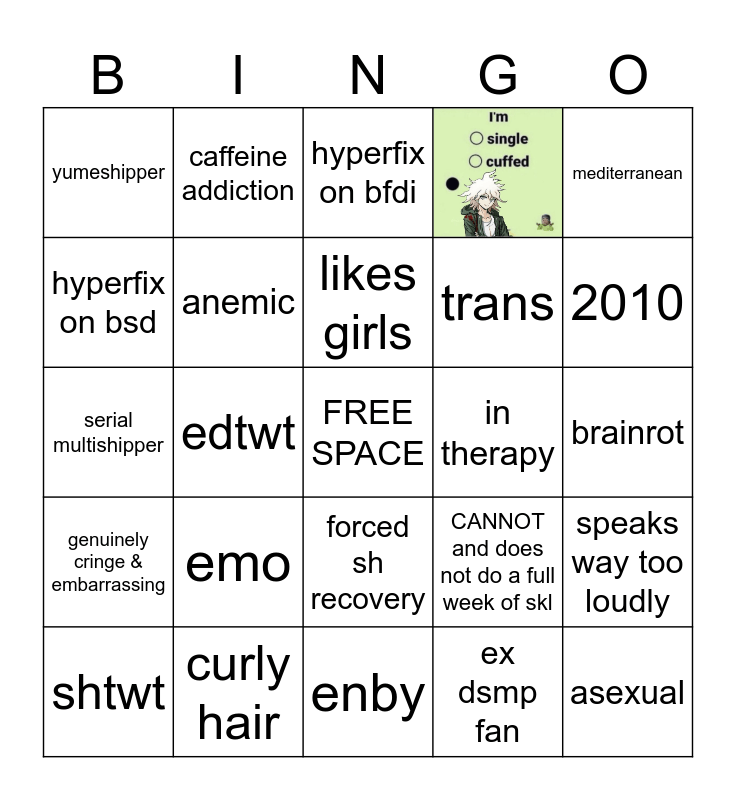 This bingo card has 1 images, a free space and 23 words: emo, curly hair, likes girls, shtwt, mediterranean, yumeshipper, hyperfix on bsd, caffeine addiction, in therapy, forced sh recovery, trans, serial multishipper, CANNOT and does not do a full week of skl, speaks way too loudly, anemic, ex dsmp fan, brainrot, hyperfix on bfdi, 2010, edtwt, asexual, genuinely cringe & embarrassing and enby.