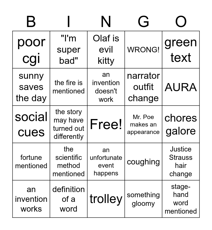 This bingo card has a free space and 24 words: the scientific method mentioned, definition of a word, an invention doesn't work, an invention works, green text, poor cgi, sunny saves the day, "I'm super bad", Mr. Poe makes an appearance, an unfortunate event happens, narrator outfit change, social cues, coughing, Justice Strauss hair change, the fire is mentioned, something gloomy, chores galore, Olaf is evil kitty, AURA, the story may have turned out differently, stage-hand word mentioned, fortune mentioned, WRONG! and trolley.