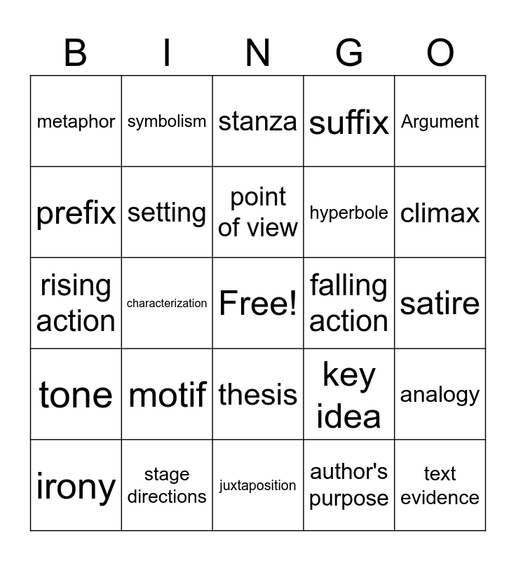 This bingo card has a free space and 34 words: theme, author's purpose, APE, plot, tone, setting, Argument, irony, symbolism, personification, point of view, stanza, simile, soliloquy, falling action, climax, stage directions, rising action, motif, key idea, thesis, conflict, metaphor, satire, juxtaposition, text evidence, suffix, dialogue, hyperbole, prefix, semicolon, characterization, analogy and affix.