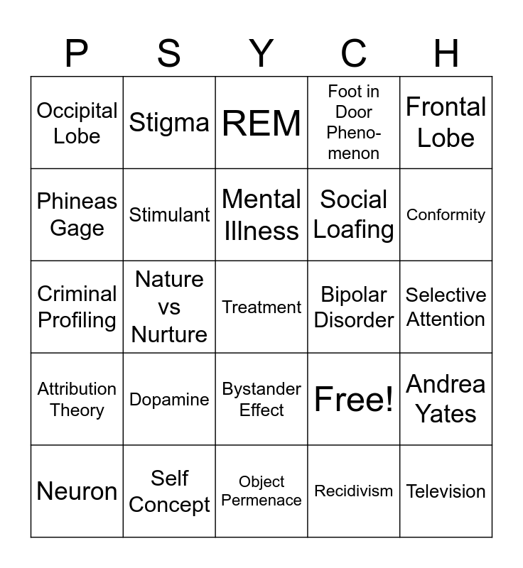This bingo card has 25 words: Dopamine, Object Permenace, Mental Illness, Neuron, Frontal Lobe, Occipital Lobe, Phineas Gage, Stigma, Bipolar Disorder, Bystander Effect, Social Loafing, Criminal Profiling, Free!, Andrea Yates, Stimulant, Television, Selective Attention, REM, Conformity, Nature vs Nurture, Treatment, Self Concept, Attribution Theory, Foot in Door Pheno-menon and Recidivism.