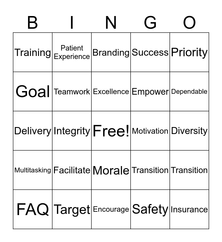 This bingo card has a free space and 27 words: Transition, Challenges, Empower, Encourage, Goal, Branding, Patient Experience, Multitasking, Motivation, Transition, Delivery, Success, FAQ, Target, Dependable, Opportunity, Teamwork, Excellence, Facilitate, Training, Diversity, Safety, Integrity, Insurance, Morale, Priority and Action Plan.
