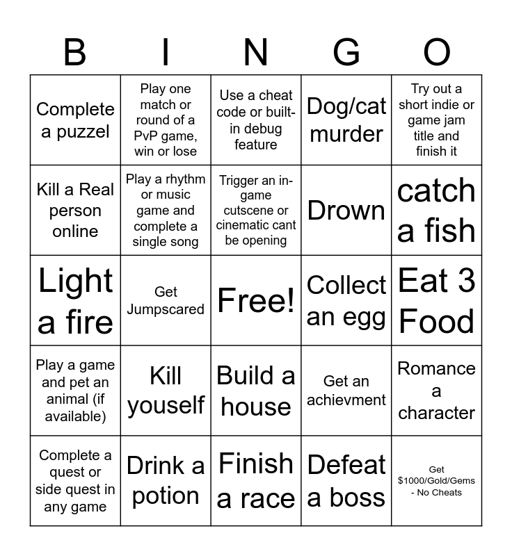 This bingo card has a free space and 34 words: Launch a game you've never opened before and reach the first checkpoint, Defeat a boss, Kill a dragon, Play a game and complete the tutorial or first mission/level, Play a game and pet an animal (if available), Play a rhythm or music game and complete a single song, Try out a short indie or game jam title and finish it, Complete a quest or side quest in any game, Play one match or round of a PvP game, win or lose, Play a retro or pixel-style game and finish one level, Trigger an in-game cutscene or cinematic cant be opening, Use a cheat code or built-in debug feature, Use a game's photo mode or camera feature and take a picture, Change the language setting in a game and complete a quest, Collect an egg, catch a fish, Drink a potion, Light a fire, Kill youself, Get an achievment, Build a house, Sit in 5 different chairs, Complete a puzzel, Eat 3 Food, Finish a race, Get $1000/Gold/Gems - No Cheats, Dog/cat murder, Do a gamble, Drown, Kill a Real person online, Complete a game, Get Jumpscared, Romance a character and break the ganiva conventions.