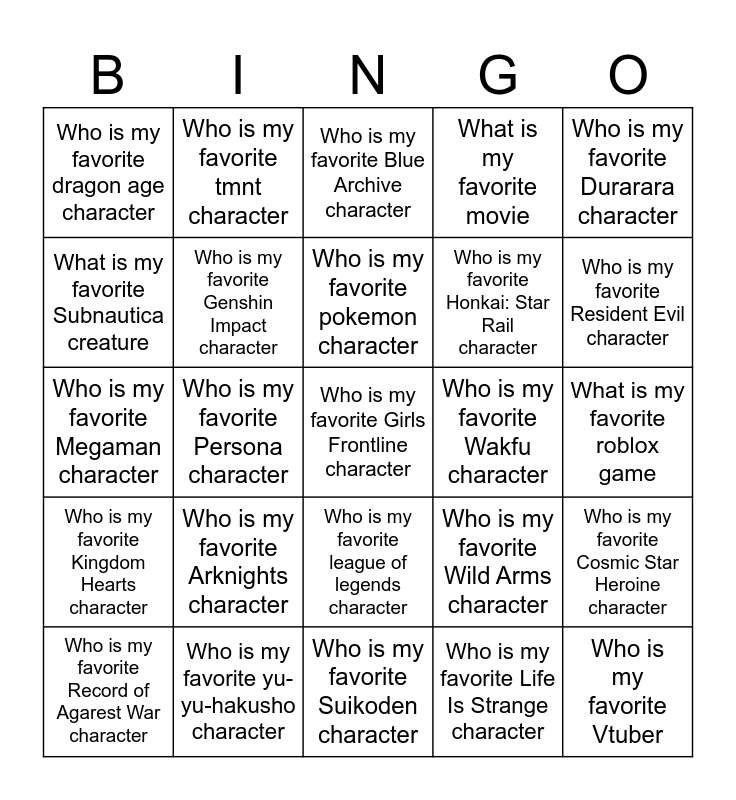 This bingo card has 25 words: Who is my favorite Arknights character, Who is my favorite Suikoden character, Who is my favorite pokemon character, Who is my favorite Record of Agarest War character, Who is my favorite Durarara character, Who is my favorite dragon age character, What is my favorite Subnautica creature, Who is my favorite tmnt character, Who is my favorite Wakfu character, Who is my favorite league of legends character, Who is my favorite Honkai: Star Rail character, Who is my favorite Megaman character, Who is my favorite Wild Arms character, Who is my favorite Cosmic Star Heroine character, Who is my favorite Genshin Impact character, Who is my favorite Vtuber, What is my favorite roblox game, Who is my favorite Blue Archive character, Who is my favorite Resident Evil character, Who is my favorite Persona character, Who is my favorite Girls Frontline character, Who is my favorite yu-yu-hakusho character, Who is my favorite Kingdom Hearts character, What is my favorite movie and Who is my favorite Life Is Strange character.