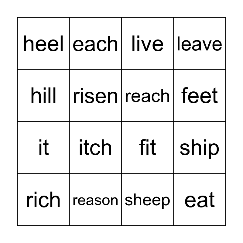 This bingo card has 16 words: reason, ship, live, heel, it, each, fit, sheep, hill, risen, rich, leave, itch, feet, reach and eat.
