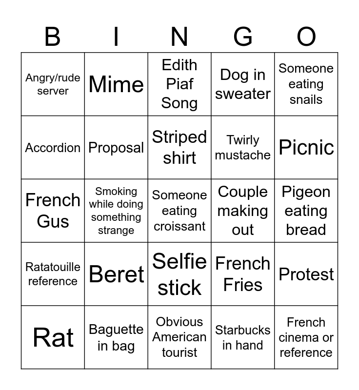 This bingo card has a free space and 24 words: Beret, Baguette in bag, Striped shirt, Rat, Someone eating snails, Angry/rude server, Accordion, Mime, Couple making out, Selfie stick, Twirly mustache, French Gus, French Fries, Protest, Proposal, Starbucks in hand, Pigeon eating bread, Edith Piaf Song, Picnic, Smoking while doing something strange, French cinema or reference, Ratatouille reference, Dog in sweater and Obvious American tourist.