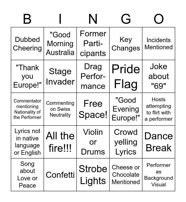 This bingo card has a free space and 24 words: All the fire!!!, Confetti, Drag Perfor-mance, Song about Love or Peace, Incidents Mentioned, Dubbed Cheering, "Thank you Europe!", "Good Morning Australia, "Good Evening Europe!", Violin or Drums, Pride Flag, Commentator mentioning Nationality of the Performer, Crowd yelling Lyrics, Dance Break, Stage Invader, Cheese or Chocolate Mentioned, Hosts attempting to flirt with a performer, Former Parti-cipants, Joke about "69", Commenting on Swiss Neutrality, Performer as Background Visual, Lyrics not in native language or English, Key Changes and Strobe Lights.