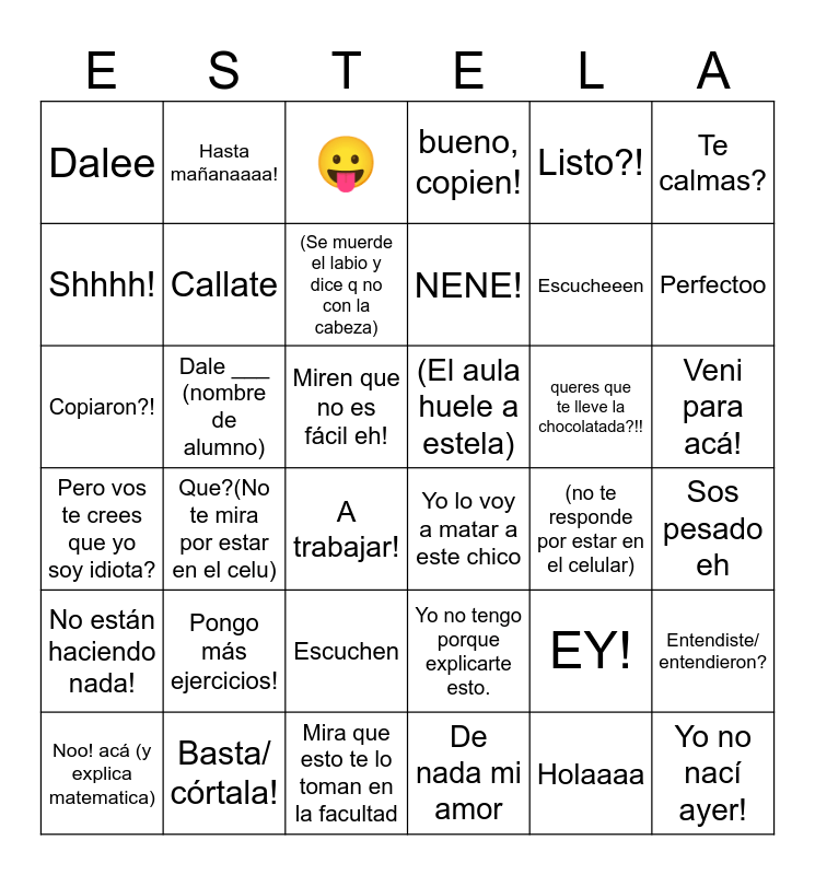 This bingo card has 36 words: Pero vos te crees que yo soy idiota?, Que?(No te mira por estar en el celu), Mira que esto te lo toman en la facultad, NENE!, queres que te lleve la chocolatada?!!, Veni para acá!, Dalee, Basta/ córtala!, 😛, Yo no tengo porque explicarte esto., Escucheeen, Te calmas?, No están haciendo nada!, Dale ___ (nombre de alumno), (Se muerde el labio y dice q no con la cabeza), bueno, copien!, EY!, Sos pesado eh, Shhhh!, Callate, A trabajar!, Yo lo voy a matar a este chico, (no te responde por estar en el celular), Entendiste/ entendieron?, Copiaron?!, Hasta mañanaaaa!, Miren que no es fácil eh!, De nada mi amor, Listo?!, Perfectoo, Noo! acá (y explica matematica), Pongo más ejercicios!, Escuchen, (El aula huele a estela), Holaaaa and Yo no nací ayer!.
