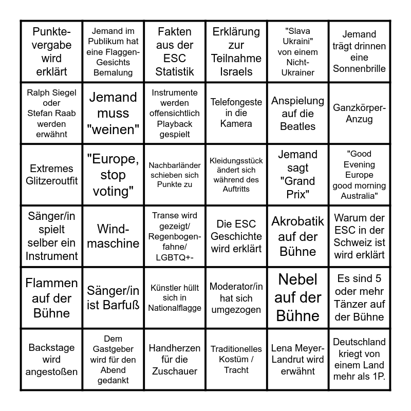 This bingo card has 36 words: Moderator/in hat sich umgezogen, Künstler hüllt sich in Nationalflagge, Traditionelles Kostüm / Tracht, Ralph Siegel oder Stefan Raab werden erwähnt, Sänger/in spielt selber ein Instrument, Kleidungsstück ändert sich während des Auftritts, Jemand muss "weinen", Handherzen für die Zuschauer, "Slava Ukraini" von einem Nicht-Ukrainer, Nebel auf der Bühne, Ganzkörper- Anzug, Erklärung zur Teilnahme Israels, Es sind 5 oder mehr Tänzer auf der Bühne, "Europe, stop voting", Telefongeste in die Kamera, Punkte-vergabe wird erklärt, Flammen auf der Bühne, Jemand sagt "Grand Prix", Extremes Glitzeroutfit, Fakten aus der ESC Statistik, Nachbarländer schieben sich Punkte zu, Wind-maschine, Die ESC Geschichte wird erklärt, Transe wird gezeigt/ Regenbogen-fahne/ LGBTQ+-, Akrobatik auf der Bühne, Jemand im Publikum hat eine Flaggen- Gesichts Bemalung, Anspielung auf die Beatles, Dem Gastgeber wird für den Abend gedankt, Instrumente werden offensichtlich Playback gespielt, Jemand trägt drinnen eine Sonnenbrille, Deutschland kriegt von einem Land mehr als 1P., Backstage wird angestoßen, Warum der ESC in der Schweiz ist wird erklärt, "Good Evening Europe good morning Australia", Sänger/in ist Barfuß and Lena Meyer-Landrut wird erwähnt.