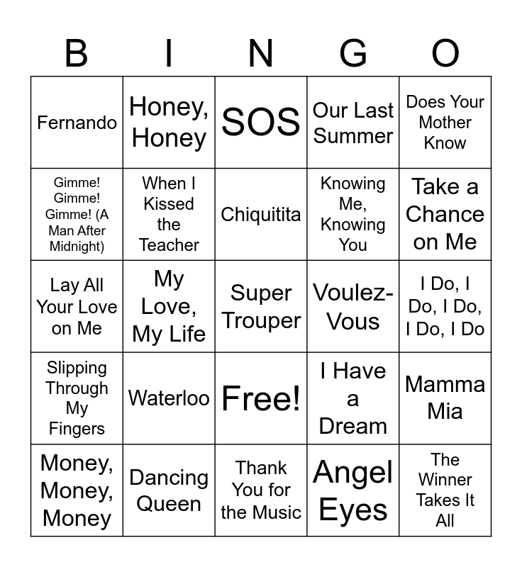 This bingo card has 26 words: Free!, Angel Eyes, Chiquitita, Dancing Queen, Does Your Mother Know, Fernando, Gimme! Gimme! Gimme! (A Man After Midnight), Honey, Honey, I Do, I Do, I Do, I Do, I Do, I Have a Dream, Knowing Me, Knowing You, Lay All Your Love on Me, Mamma Mia, Money, Money, Money, My Love, My Life, The Name of the Game, Our Last Summer, Slipping Through My Fingers, SOS, Super Trouper, Take a Chance on Me, Thank You for the Music, Voulez-Vous, Waterloo, When I Kissed the Teacher and The Winner Takes It All.