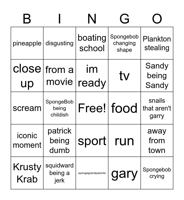 This bingo card has a free space and 24 words: patrick being dumb, squidward being a jerk, im ready, Krusty Krab, Plankton stealing, pineapple, close up, disgusting, food, sport, tv, scream, run, away from town, from a movie, gary, snails that aren't garry, boating school, Sandy being Sandy, SpongeBob being childish, Spongebob crying, iconic moment, Spongebob changing shape and spongegrandparents.