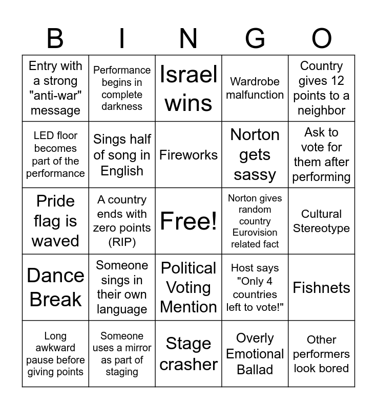 This bingo card has a free space and 26 words: Political Voting Mention, Overly Emotional Ballad, Fireworks, Someone uses a mirror as part of staging, Country gives 12 points to a neighbor, Entry with a strong "anti-war" message, LED floor becomes part of the performance, Performance begins in complete darkness, Cultural Stereotype, Host says "Only 4 countries left to vote!", Norton gets sassy, Pride flag is waved, Fishnets, Long awkward pause before giving points, A country ends with zero points (RIP), Audience Booing, Wardrobe malfunction, Dance Break, Israel wins, Other performers look bored, Ask to vote for them after performing, Stage crasher, Norton gives random country Eurovision related fact, Someone sings in their own language, Sings half of song in English and Someone falls asleep before the winner is announced.