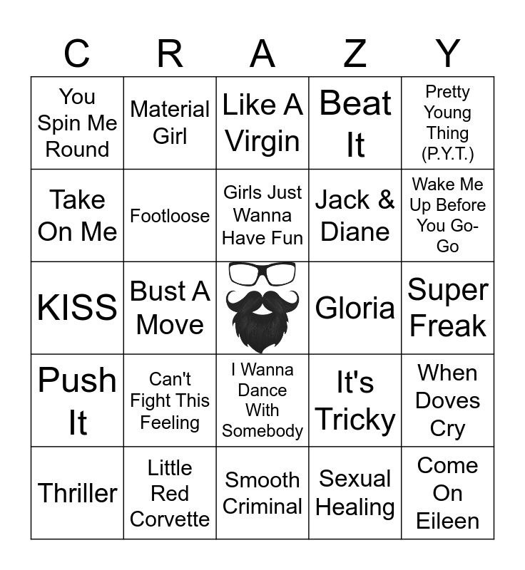 This bingo card has a free space and 39 words: Love Shack, Billie Jean, Celebration, Footloose, Thriller, I Wanna Dance With Somebody, Girls Just Wanna Have Fun, Jessie's Girl, Pretty Young Thing (P.Y.T.), Push It, Bust A Move, Beat It, Come On Eileen, Super Freak, Gloria, Can't Fight This Feeling, Your Love, You Spin Me Round, White Wedding, It's Tricky, Take On Me, Smooth Criminal, Jack & Diane, Wake Me Up Before You Go-Go, It's Raining Men, Uptown Girl, Tainted Love, Funkytown, Every Breath You Take, Material Girl, Dancing In The Dark, The Way You Make Me Feel, Like A Virgin, Little Red Corvette, Sexual Healing, Purple Rain, When Doves Cry, KISS and All Night Long.