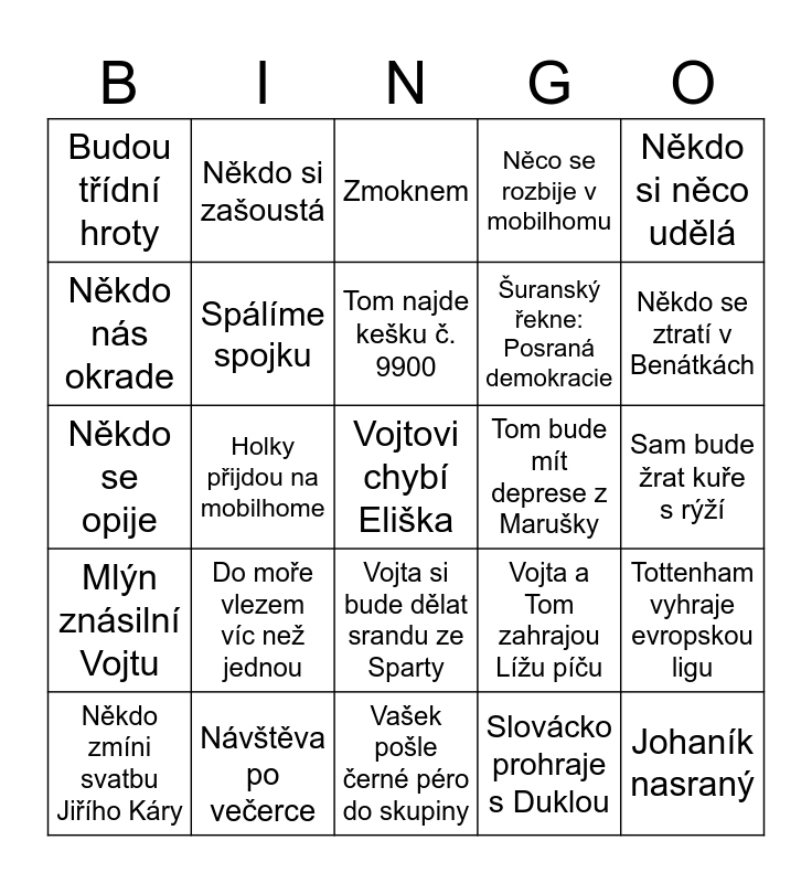 This bingo card has a free space and 24 words: Do moře vlezem víc než jednou, Návštěva po večerce, Tom najde kešku č. 9900, Někdo zmíni svatbu Jiřího Káry, Někdo si něco udělá, Budou třídní hroty, Někdo nás okrade, Někdo si zašoustá, Tom bude mít deprese z Marušky, Vojta si bude dělat srandu ze Sparty, Šuranský řekne: Posraná demokracie, Někdo se opije, Vojta a Tom zahrajou Lížu píču, Tottenham vyhraje evropskou ligu, Spálíme spojku, Slovácko prohraje s Duklou, Sam bude žrat kuře s rýží, Zmoknem, Někdo se ztratí v Benátkách, Holky přijdou na mobilhome, Johaník nasraný, Mlýn znásilní Vojtu, Něco se rozbije v mobilhomu and Vašek pošle černé péro do skupiny.