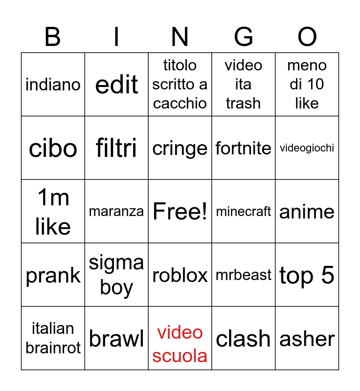 This bingo card has a free space and 24 words: sigma boy, brawl, cringe, italian brainrot, meno di 10 like, indiano, cibo, edit, minecraft, roblox, fortnite, 1m like, mrbeast, top 5, filtri, clash, anime, titolo scritto a cacchio, videogiochi, maranza, asher, prank, video ita trash and video scuola.